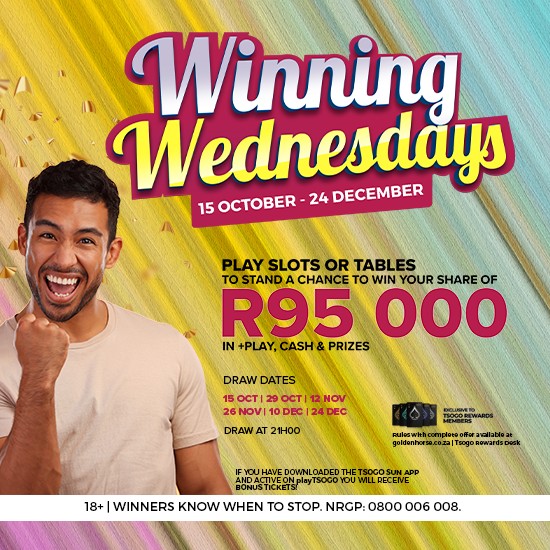Elevate your midweek with a share of over R95k in prizes in our WINNING WEDNESDAYS promotion. Play Slots or Tables on draw days and earn 100 points per ticket from 08h00 – 20h45 to qualify.